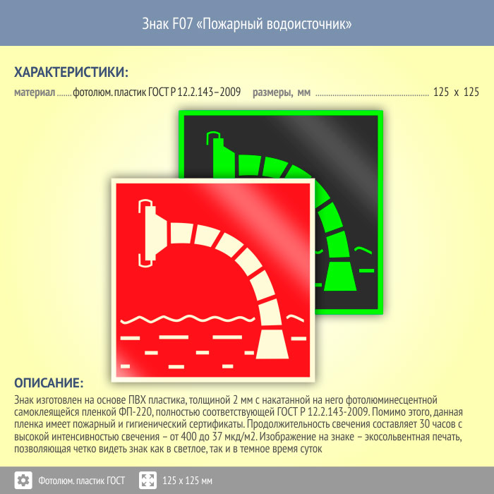 Знак F07 «Пожарный водоисточник» (фотолюминесцентный пластик ГОСТ 34428-2018, 125х125 мм) в Магнитогорске купить