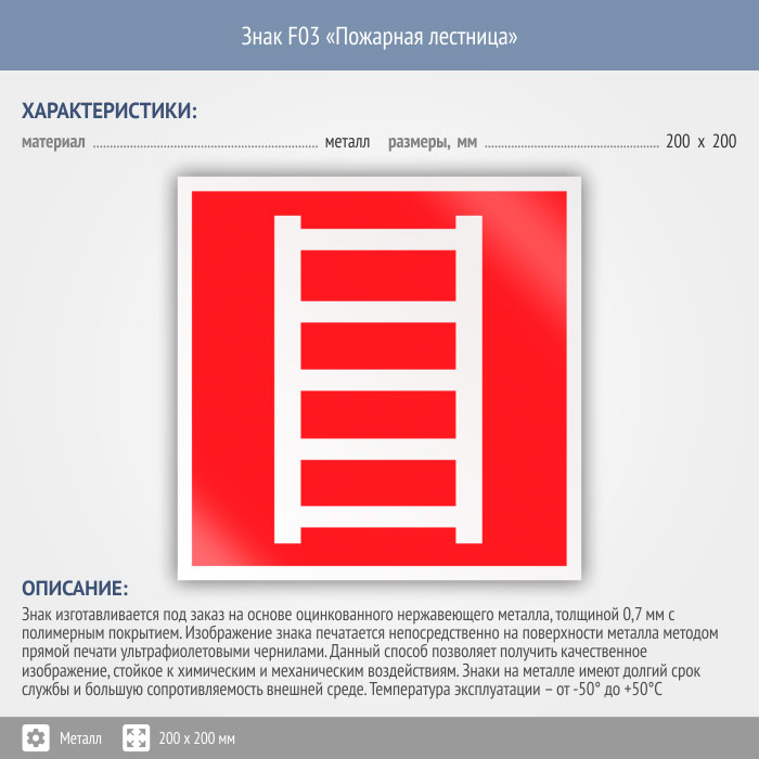 Знак F03 «Пожарная лестница» (металл, 200х200 мм) в Магнитогорске купить
