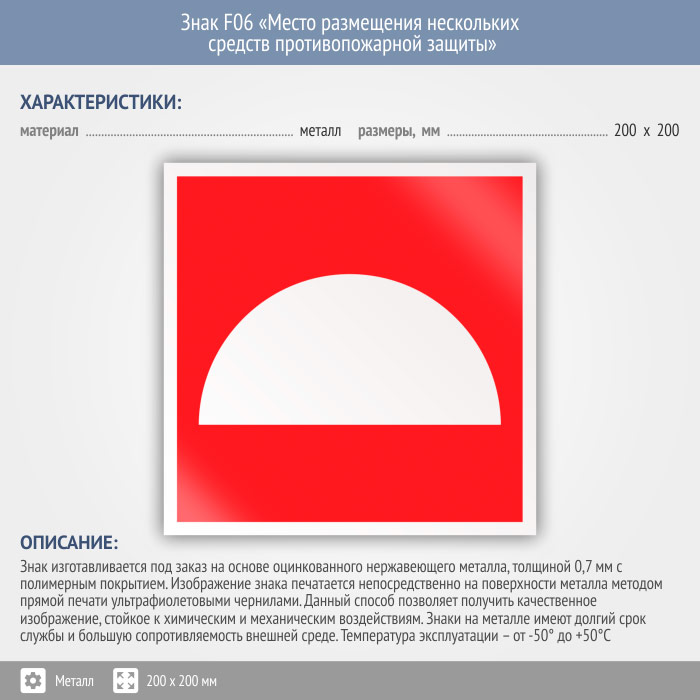 Знак F06 «Место размещения нескольких средств противопожарной защиты» (металл, 200х200 мм) в Магнитогорске купить