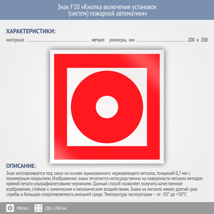 Знак F10 «Кнопка включения установок (систем) пожарной автоматики» (металл, 200х200 мм) в Магнитогорске купить