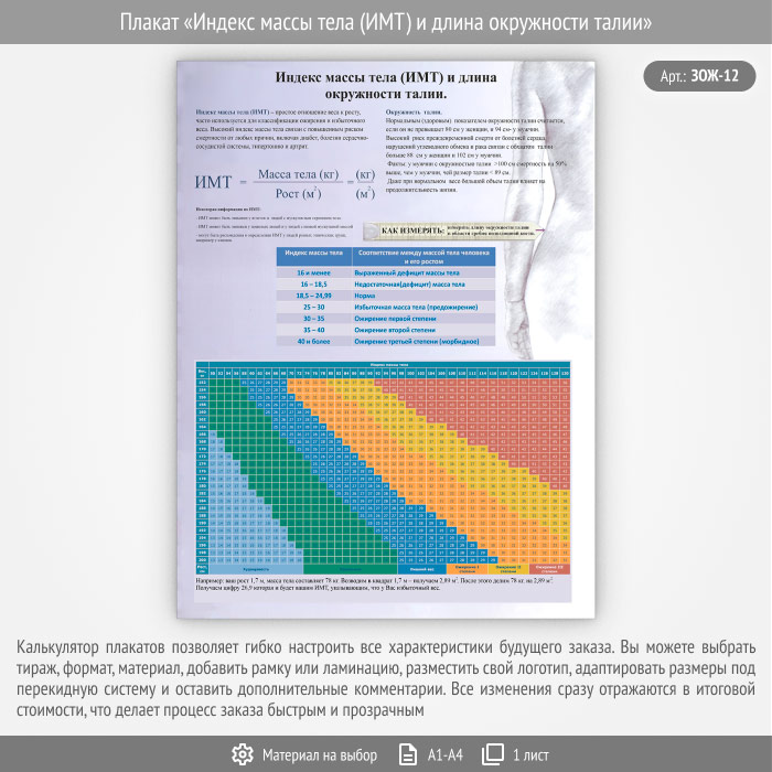 Плакат «Индекс массы тела (ИМТ) и длина окружности талии» (ЗОЖ-12, 1 лист) в Магнитогорске купить